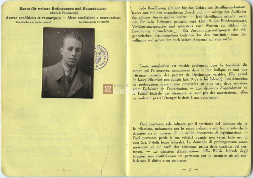 notizie storico-critiche | Libretto per stranieri rilasciato dalla Svizzera per permesso di dimora nel Cantone Vaud, allo scopo di studio. Nel 1939 Gilberto Coen, a seguito dell'emanazione delle leggi razziste, emigra in Svizzera dove si iscrive all'Università di Losanna al ciclo di studi in Ingegneria chimica. Come riportato sul libretto, la data di entrata in Svizzera è il 25 aprile 1939. |