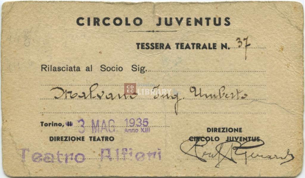 notizie storico-critiche | La tessera teatrale n. 37 del Circolo Juventus per il Teatro Alfieri di Torino fu rilasciata al Socio Ing. Umberto Malvano il 3 maggio 1935. Sul documento sono presenti due ritratti in fototessera, quello di Umberto Malvano a sinistra e quello di una giovane donna, famigliare del socio. |