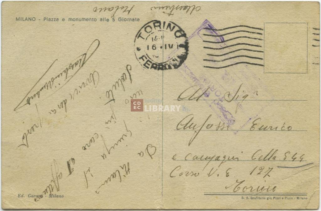 | notizie storico-critiche | La cartolina fu inviata a Enrico Avigdor (alias Enrico Anfossi) e compagni della Cella S44 durante la sua reclusione nelle carceri Nuove di Torino |
