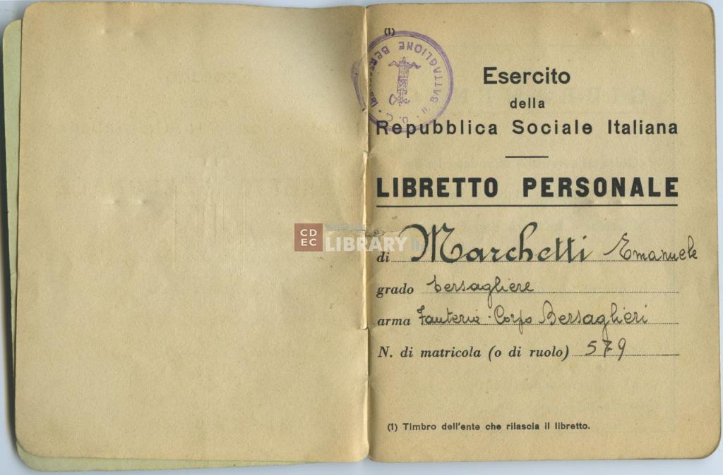 notizie storico-critiche | Il Libretto personale rilasciato dal Ministero delle Forze Armate dell'Esercito della Repubblica Sociale Italiana fu rilasciato al Bersagliere Emanuele Marchetti, che prestò giuramento di fedeltà in Alessandria il 30 gennaio 1944. Il soldato fu catturato dai Partigiani. |