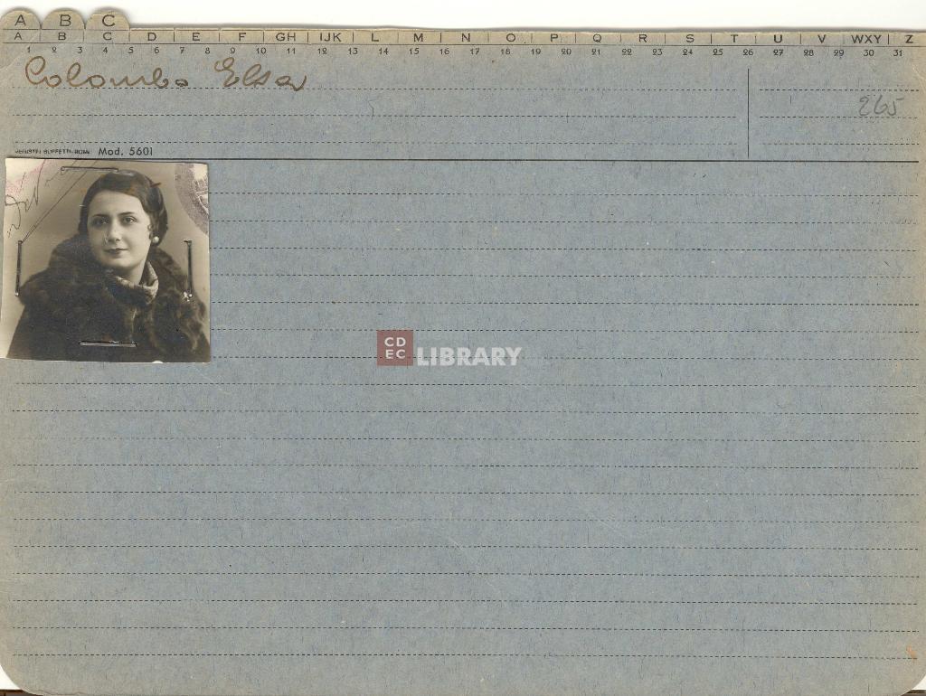 Elsa Colombo, figlia di Giuseppe Colombo e Maria Garelli è nata in Italia a Asti il 25 luglio 1907. Arrestata a Milano (Milano). Deportata nel campo di sterminio di Auschwitz. Non è sopravvissuta alla Shoah. luogo di arresto: Milano data di arresto: 08/01/1944 luogo di detenzione: MILANO carcere luogo di raccolta: MILANO carcere destino: Morto/a in campo di sterminio numero di convoglio: convoglio n. 06, 30/01/1944 data di partenza del convoglio: 30/01/1944 data di arrivo del convoglio: 06/02/1944 campo di destinazione: Auschwitz numero di matricola: - |