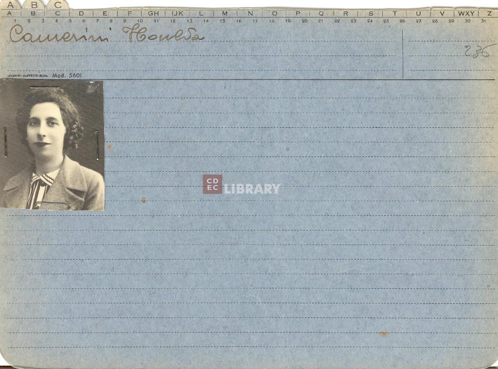 Ulda Camerini, figlia di Donato Camerini e Orsola Amar è nata in Italia a Parma il 20 giugno 1906. Arrestata a Reno di Tizzano (Parma). Deportata nel campo di sterminio di Auschwitz. Non è sopravvissuta alla Shoah.