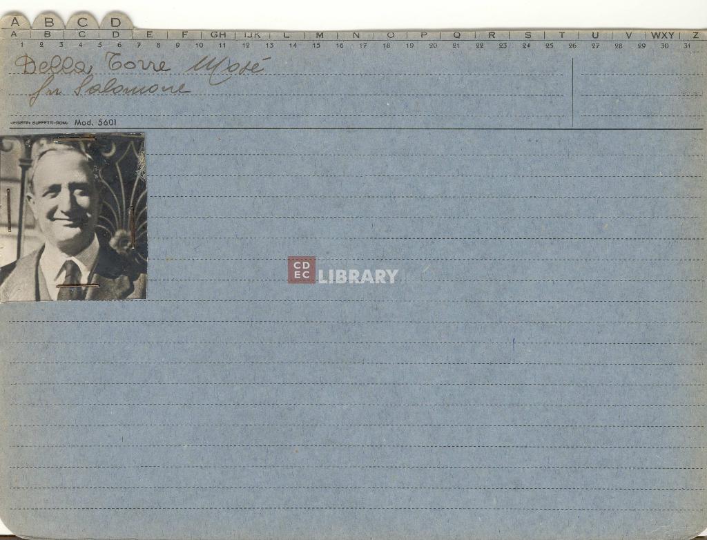Mosè Della Torre, figlio di Salomone Della Torre e Rosa Gattegna è nato in Italia a Roma l' 1 settembre 1879. Coniugato con Ester Di Nepi. Arrestato a Roma (Roma). Deportato nel campo di sterminio di Auschwitz. Non è sopravvissuto alla Shoah. luogo di arresto: Roma data di arresto: 09/05/1944 luogo di detenzione: ROMA carcere luogo di raccolta: FOSSOLI campo destino: Morto/a in campo di sterminio numero di convoglio: convoglio n. 13, 26/06/1944 data di partenza del convoglio: 26/06/1944 data di arrivo del convoglio: 30/06/1944 campo di destinazione: Auschwitz numero di matricola: S |
