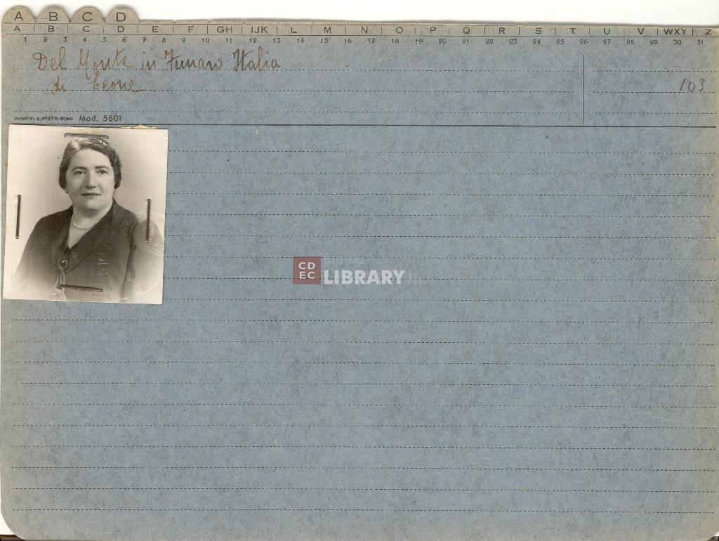 Italia Del Monte, figlia di Leone Del Monte e Belladonna Mieli è nata in Italia a Roma il 21 marzo 1896. Coniugata con Samuele Funaro. Arrestata a Roma (Roma). Deportata nel campo di sterminio di Auschwitz. Non è sopravvissuta alla Shoah. luogo di arresto: Roma data di arresto: 19/11/1943 luogo di detenzione: ROMA luogo di raccolta: FOSSOLI campo destino: Morto/a in campo di sterminio numero di convoglio: convoglio n. 09, 05/04/1944 data di partenza del convoglio: 05/04/1944 data di arrivo del convoglio: 10/04/1944 campo di destinazione: Auschwitz numero di matricola: - |