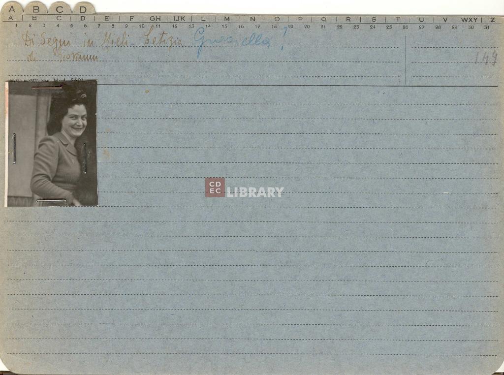 Graziella Di Segni, figlia di Giovanni Di Segni e Emma Sabatello è nata in Italia a Roma il 26 settembre 1915. Coniugata con Pacifico Mieli. Arrestata a Roma (Roma). Deportata nel campo di sterminio di Auschwitz. Non è sopravvissuta alla Shoah. luogo di arresto: Roma data di arresto: 16/10/1943 luogo di detenzione: ROMA Collegio Militare luogo di raccolta: ROMA Collegio Militare destino: Morto/a in campo di sterminio numero di convoglio: convoglio n. 02, 18/10/1943 data di partenza del convoglio: 18/10/1943 data di arrivo del convoglio: 23/10/1943 campo di destinazione: Auschwitz numero di matricola: ? |