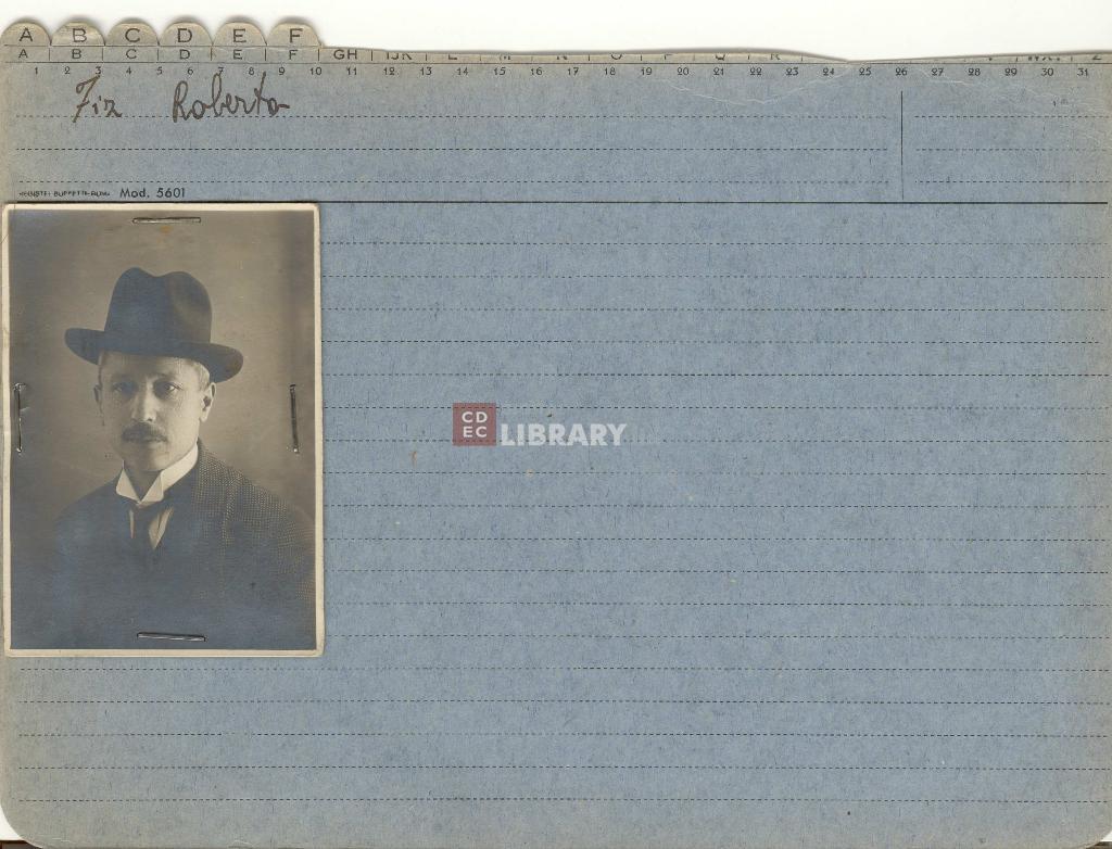 Roberto Fiz, figlio di Angelo Fiz e Erminia Castelfranco è nato in Italia a Casale Monferrato il 7 settembre 1873. Arrestato a Casale Monferrato (Alessandria). Deportato nel campo di sterminio di Auschwitz. Non è sopravvissuto alla Shoah. luogo di arresto: Casale Monferrato data di arresto: 13/04/1944 luogo di detenzione: TORINO carcere luogo di raccolta: FOSSOLI campo destino: Morto/a in campo di sterminio numero di convoglio: convoglio n. 10, 16/05/1944 data di partenza del convoglio: 16/05/1944 data di arrivo del convoglio: 23/05/1944 campo di destinazione: Auschwitz numero di matricola: S |