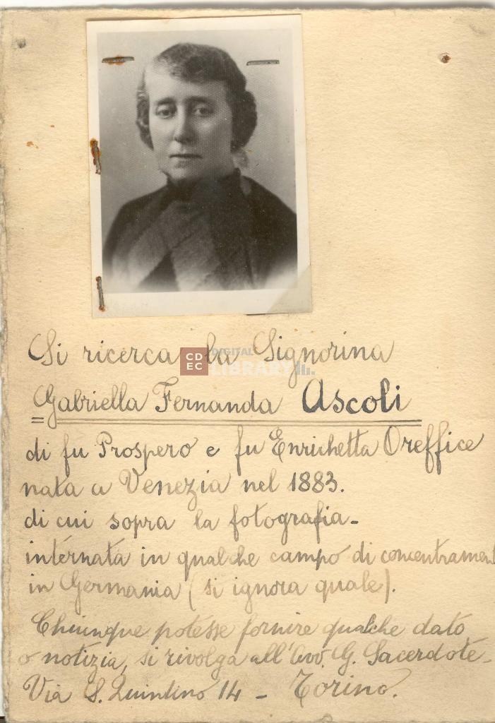 Gabriella Fernanda Ascoli, figlia di Prospero Ascoli e Enrichetta Orefice è nata in Italia a Venezia il 9 novembre 1883. Arrestata a Venezia (Venezia). Non è sopravvissuta alla Shoah. luogo di arresto: Venezia data di arresto: 06/10/1944 luogo di detenzione: VENEZIA ospedale luogo di raccolta: TRIESTE Risiera San Sabba campo destino: Morto/a in campo di sterminio numero di matricola: - |
