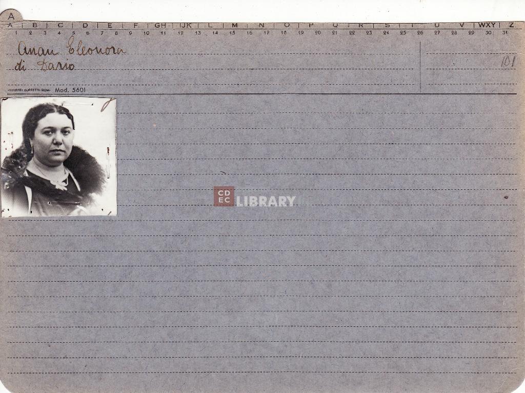 Eleonora Anav, figlia di Dario Anav e Settimia Caviglia è nata in Italia a Roma il 6 settembre 1908. Coniugata con Lazzaro Spizzichino. Arrestata a Roma (Roma). Deportata nel campo di sterminio di Auschwitz. Non è sopravvissuta alla Shoah. luogo di arresto: Roma data di arresto: 27/03/1944 luogo di detenzione: ROMA luogo di raccolta: FOSSOLI campo destino: Morto/a in campo di sterminio numero di convoglio: convoglio n. 10, 16/05/1944 data di partenza del convoglio: 16/05/1944 data di arrivo del convoglio: 23/05/1944 campo di destinazione: Auschwitz numero di matricola: - |