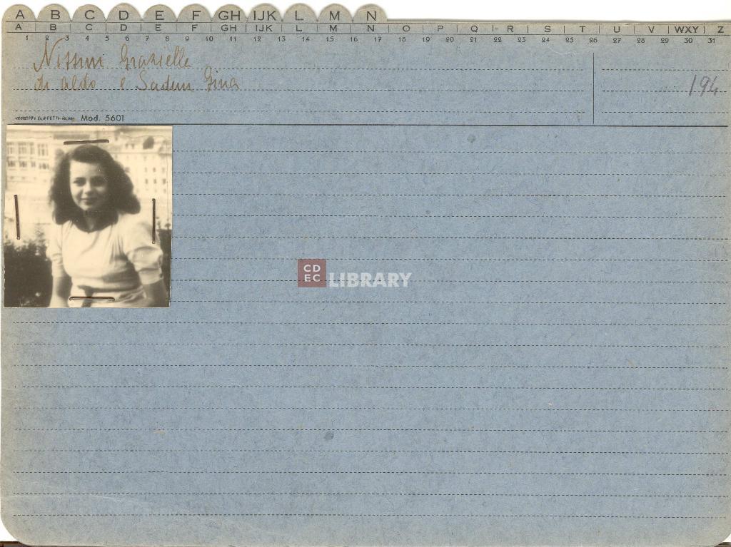 Graziella Nissim, figlia di Aldo Nissim e Gina Sadun è nata in Italia a Siena il 27 aprile 1929. Arrestata a Siena (Siena). Deportata nel campo di sterminio di Auschwitz. Non è sopravvissuta alla Shoah. luogo di arresto: Siena data di arresto: 06/11/1943 luogo di detenzione: SIENA caserma luogo di raccolta: BOLOGNA carcere destino: Morto/a in campo di sterminio numero di convoglio: convoglio n. 03, 09/11/1943 data di partenza del convoglio: 09/11/1943 data di arrivo del convoglio: 14/11/1943 campo di destinazione: Auschwitz numero di matricola: ? |