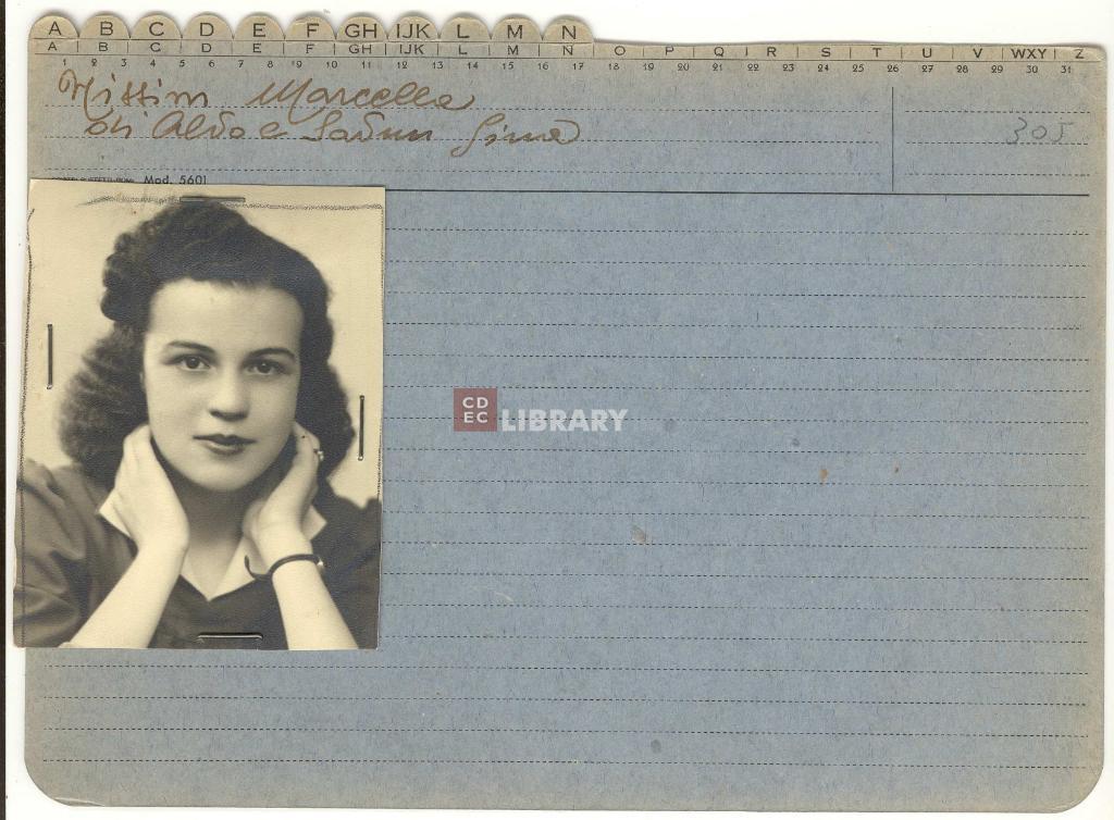 Marcella Nissim, figlia di Aldo Nissim e Gina Sadun è nata in Italia a Siena il 22 luglio 1923. Arrestata a Siena (Siena). Deportata nel campo di sterminio di Auschwitz. Non è sopravvissuta alla Shoah. luogo di arresto: Siena data di arresto: 06/11/1943 luogo di detenzione: SIENA caserma luogo di raccolta: BOLOGNA carcere destino: Morto/a in campo di sterminio numero di convoglio: convoglio n. 03, 09/11/1943 data di partenza del convoglio: 09/11/1943 data di arrivo del convoglio: 14/11/1943 campo di destinazione: Auschwitz numero di matricola: - |