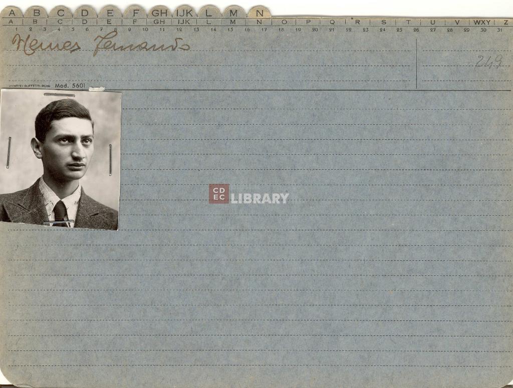 Ferdinando Nemes, figlio di Enrico Nemes e Giovanna Friedrich è nato in Italia a Fiume l' 8 giugno 1921. Arrestato a Roma (Roma). Deportato nel campo di sterminio di Auschwitz. È sopravvissuto alla Shoah. luogo di arresto: Roma data di arresto: 16/10/1943 luogo di detenzione: ROMA Collegio Militare luogo di raccolta: ROMA Collegio Militare numero di convoglio: convoglio n. 02, 18/10/1943 data di partenza del convoglio: 18/10/1943 data di arrivo del convoglio: 23/10/1943 campo di destinazione: Auschwitz numero di matricola: 158638 data di liberazione: 11/04/1945 |