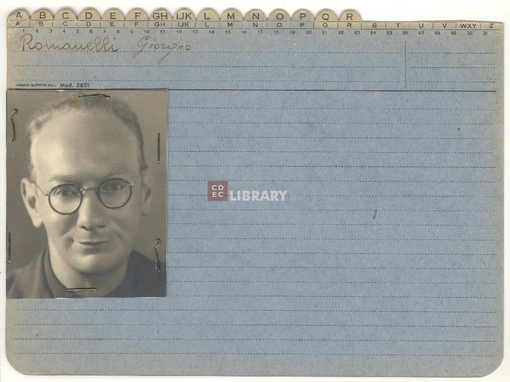 Giorgio Romanelli, figlio di Alberto Romanelli e Rosa Di Capua è nato in Italia a Roma il 14 maggio 1904. Arrestato a Roma (Roma). Deportato nel campo di sterminio di Auschwitz. Non è sopravvissuto alla Shoah. luogo di arresto: Roma data di arresto: 16/10/1943 luogo di detenzione: ROMA Collegio Militare luogo di raccolta: ROMA Collegio Militare destino: Morto/a in campo di sterminio numero di convoglio: convoglio n. 02, 18/10/1943 data di partenza del convoglio: 18/10/1943 data di arrivo del convoglio: 23/10/1943 campo di destinazione: Auschwitz numero di matricola: ? |