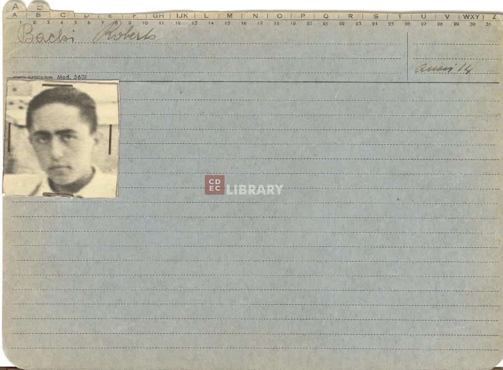 Roberto Bachi, figlio di Armando Bachi e Ines Bassani è nato in Italia a Torino il 12 marzo 1929. Arrestato a Torrechiara (Parma). Deportato nel campo di sterminio di Auschwitz. Non è sopravvissuto alla Shoah. luogo di arresto: Torrechiara data di arresto: 17/10/1943 luogo di detenzione: MILANO carcere luogo di raccolta: MILANO carcere destino: Morto/a in campo di sterminio numero di convoglio: convoglio n. 05, 06/12/1943 data di partenza del convoglio: 06/12/1943 data di arrivo del convoglio: 11/12/1943 campo di destinazione: Auschwitz numero di matricola: 167973 |