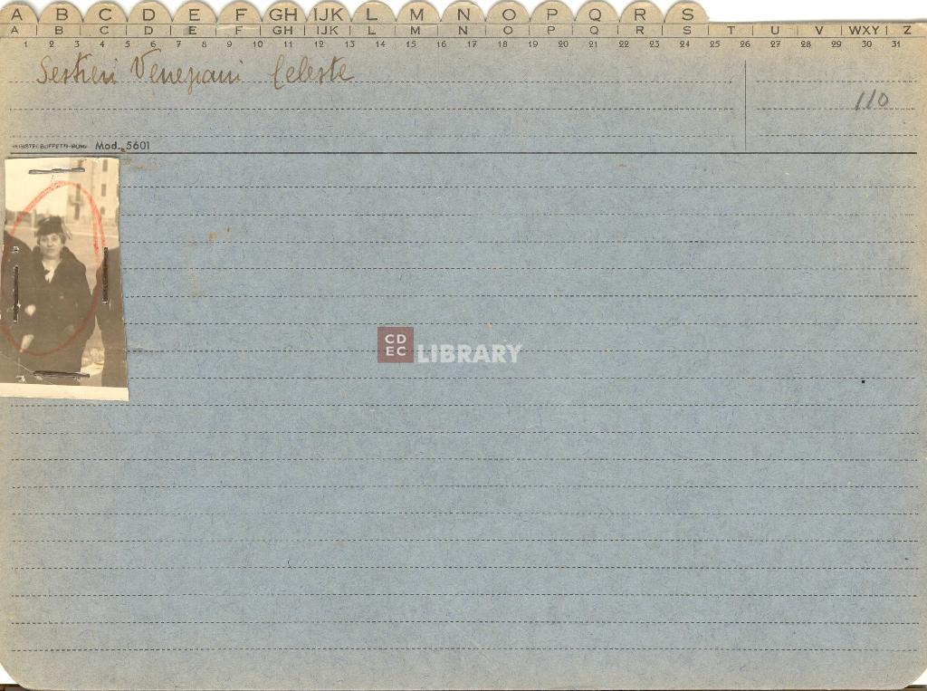 Celeste Sestieri, figlia di Sabato Sestieri e Luna Di Veroli è nata in Italia a Roma l' 1 aprile 1884. Coniugata con Giacomo Veneziani. Arrestata a Roma (Roma). Deportata nel campo di sterminio di Auschwitz. Non è sopravvissuta alla Shoah. luogo di arresto: Roma data di arresto: 02/02/1944 luogo di detenzione: ROMA carcere luogo di raccolta: FOSSOLI campo destino: Morto/a in campo di sterminio numero di convoglio: convoglio n. 10, 16/05/1944 data di partenza del convoglio: 16/05/1944 data di arrivo del convoglio: 23/05/1944 campo di destinazione: Auschwitz numero di matricola: S |