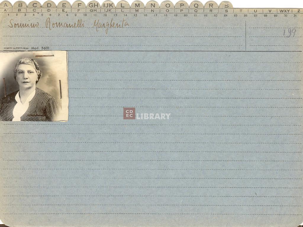 Margherita Sonnino, figlia di Leone Sonnino e Emilia Castelnuovo è nata in Italia a Teramo il 23 luglio 1884. Coniugata con Angelo Romanelli. Arrestata a Roma (Roma). Deportata nel campo di sterminio di Auschwitz. Non è sopravvissuta alla Shoah. luogo di arresto: Roma data di arresto: 16/10/1943 luogo di detenzione: ROMA Collegio Militare luogo di raccolta: ROMA Collegio Militare destino: Morto/a in campo di sterminio numero di convoglio: convoglio n. 02, 18/10/1943 data di partenza del convoglio: 18/10/1943 data di arrivo del convoglio: 23/10/1943 campo di destinazione: Auschwitz numero di matricola: S |