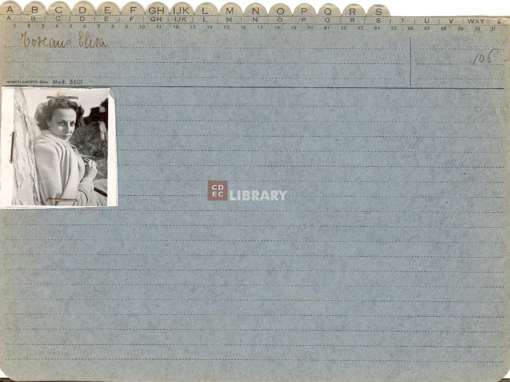 Elisa Toscano, figlia di Mario Mosè Toscano e Gemma Di Laudadio è nata in Italia a Roma il 25 novembre 1916. Arrestata a Roma (Roma). Deportata nel campo di sterminio di Auschwitz. Non è sopravvissuta alla Shoah. luogo di arresto: Roma data di arresto: 16/10/1943 luogo di detenzione: ROMA Collegio Militare luogo di raccolta: ROMA Collegio Militare destino: Morto/a in campo di sterminio numero di convoglio: convoglio n. 02, 18/10/1943 data di partenza del convoglio: 18/10/1943 data di arrivo del convoglio: 23/10/1943 campo di destinazione: Auschwitz numero di matricola: - |