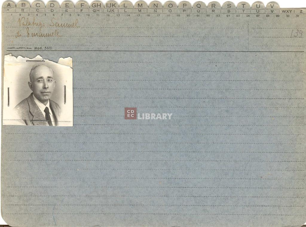 Samuele Davide Valabrega, figlio di Emanuele Valabrega e Silvia Cecilia De Benedetti è nato in Italia a Roma il 19 febbraio 1892. Arrestato a Roma (Roma). Deportato nel campo di sterminio di Auschwitz. Non è sopravvissuto alla Shoah. luogo di arresto: Roma data di arresto: 16/10/1943 luogo di detenzione: ROMA Collegio Militare luogo di raccolta: ROMA Collegio Militare destino: Morto/a in campo di sterminio numero di convoglio: convoglio n. 02, 18/10/1943 data di partenza del convoglio: 18/10/1943 data di arrivo del convoglio: 23/10/1943 campo di destinazione: Auschwitz numero di matricola: - |