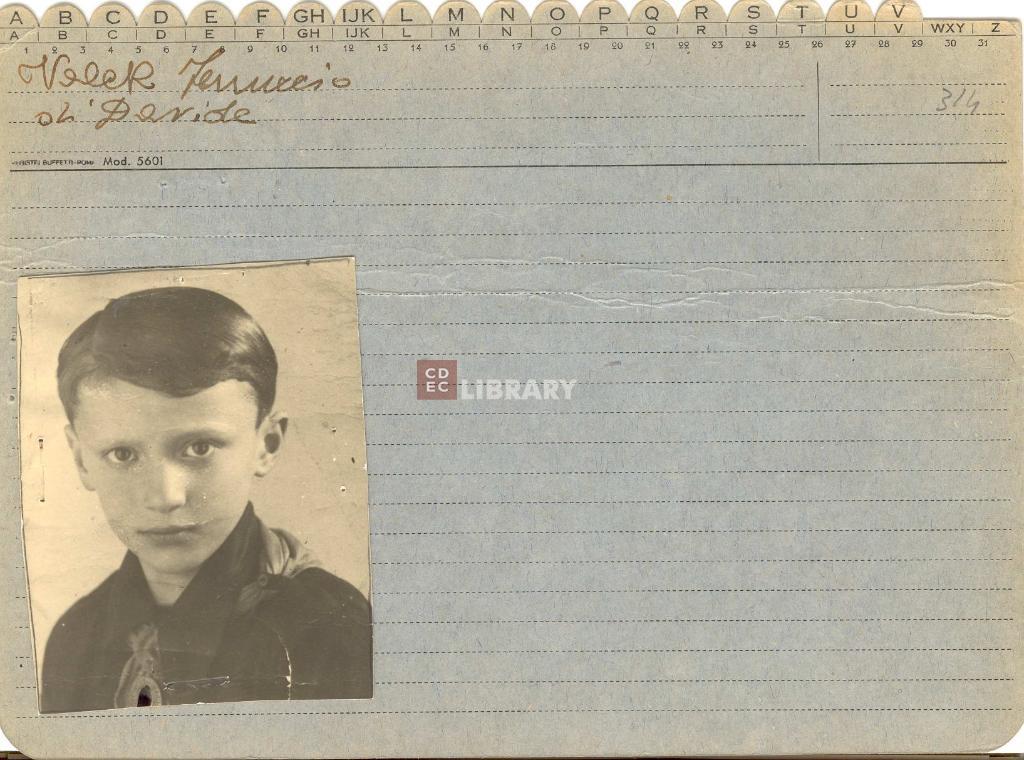 Ferruccio Valech, figlio di Mosè Davide Valech e Livia Forti è nato in Italia a Siena il 14 novembre 1930. Arrestato a Siena (Siena). Deportato nel campo di sterminio di Auschwitz. Non è sopravvissuto alla Shoah. luogo di arresto: Siena data di arresto: 06/11/1943 luogo di detenzione: SIENA carcere luogo di raccolta: BOLOGNA carcere destino: Morto/a in campo di sterminio numero di convoglio: convoglio n. 03, 09/11/1943 data di partenza del convoglio: 09/11/1943 data di arrivo del convoglio: 14/11/1943 campo di destinazione: Auschwitz numero di matricola: S |