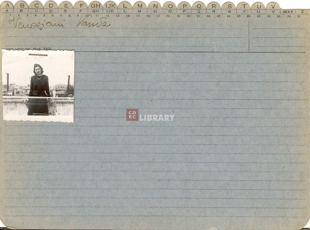 Wanda Veneziani, figlia di Pellegrino Veneziani e Margherita Coen è nata in Italia a Roma l' 11 luglio 1904. Arrestata a Roma (Roma). Deportata nel campo di sterminio di Auschwitz. Non è sopravvissuta alla Shoah. luogo di arresto: Roma data di arresto: 16/10/1943 luogo di detenzione: ROMA Collegio Militare luogo di raccolta: ROMA Collegio Militare destino: Morto/a in campo di sterminio numero di convoglio: convoglio n. 02, 18/10/1943 data di partenza del convoglio: 18/10/1943 data di arrivo del convoglio: 23/10/1943 campo di destinazione: Auschwitz numero di matricola: - |