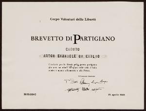ambiti e contenuto | Copie fotografiche di targhe commemorative in memoria di Emanuele Artom e brevetto di partigiano. |